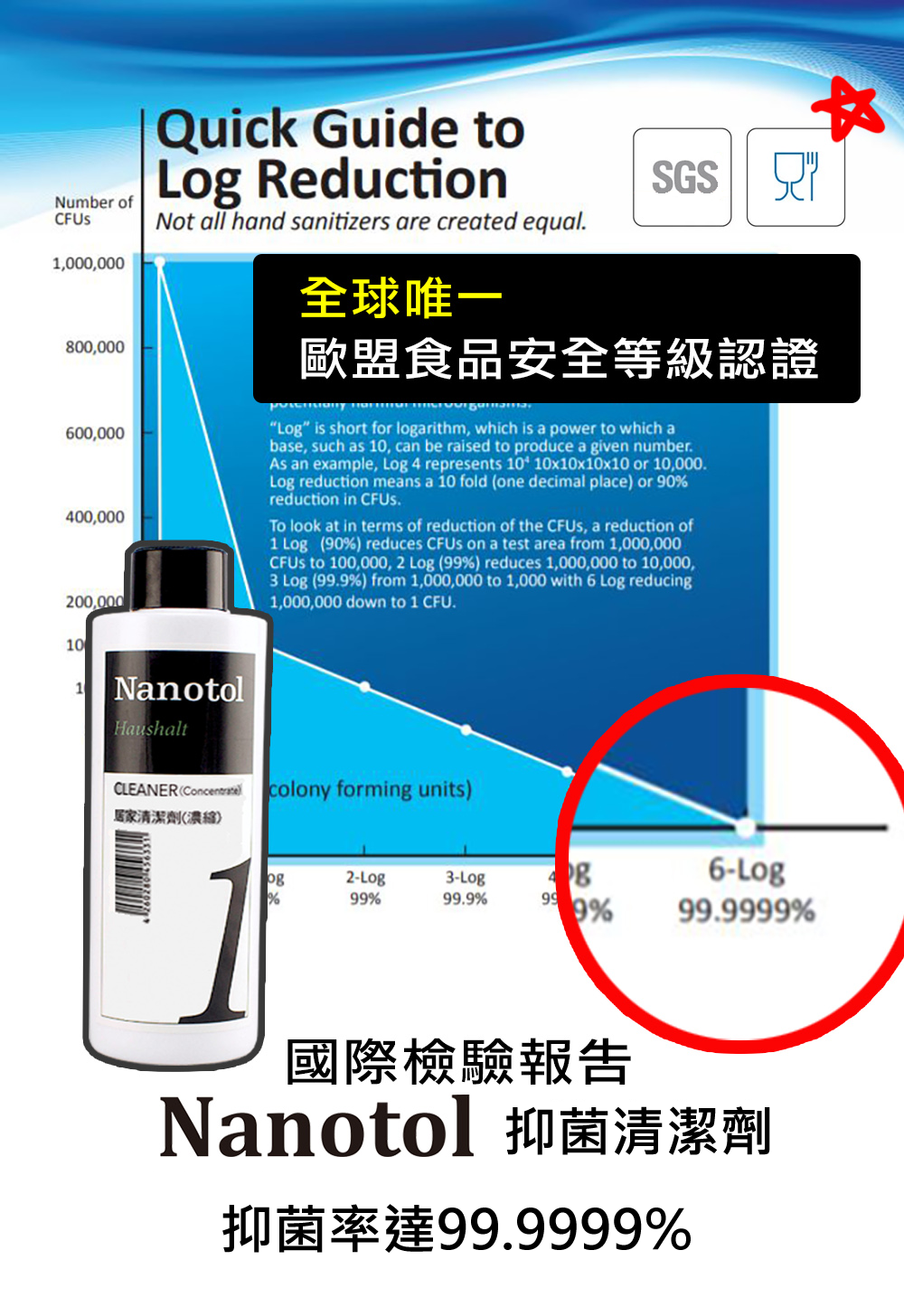 德國SGS檢驗報告指出殺菌率達6-Log(99.9999%)